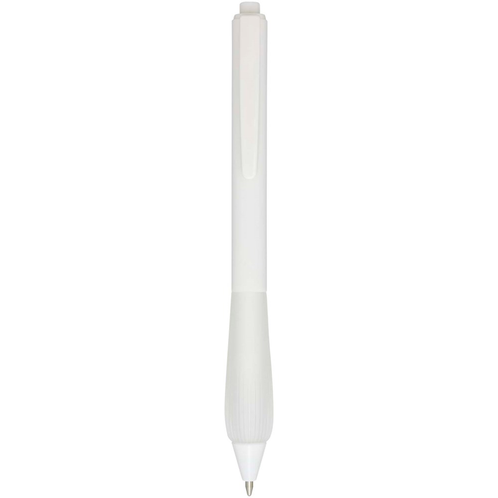 Kugelschreiber aus recyceltem Kunststoff mit gummiertem Schaft und Griff aus TPR. Tintenfarbe: Schwarz. Schreiblänge: 1000 Meter. Strichstärke: 1,0 mm.