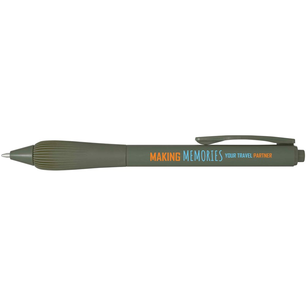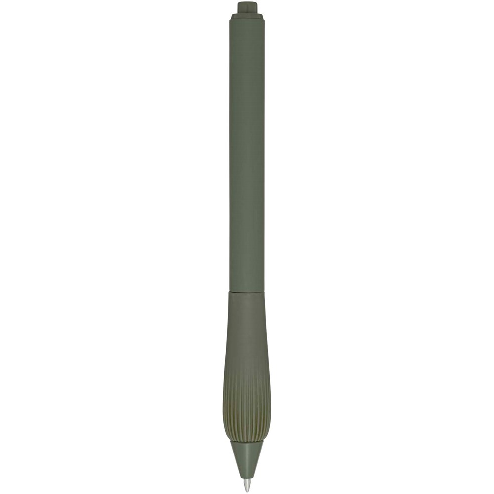 Kugelschreiber aus recyceltem Kunststoff mit gummiertem Schaft und Griff aus TPR. Tintenfarbe: Schwarz. Schreiblänge: 1000 Meter. Strichstärke: 1,0 mm.