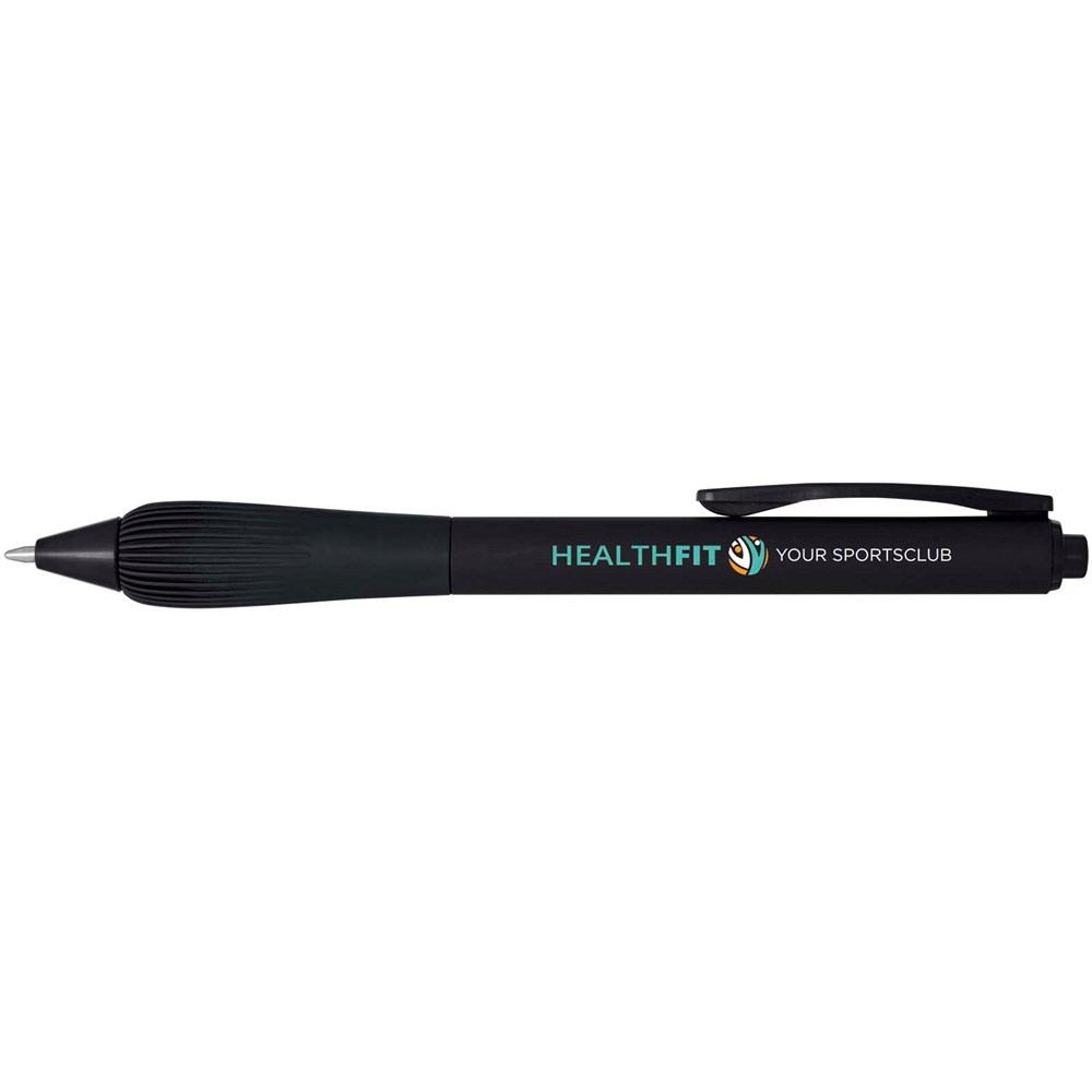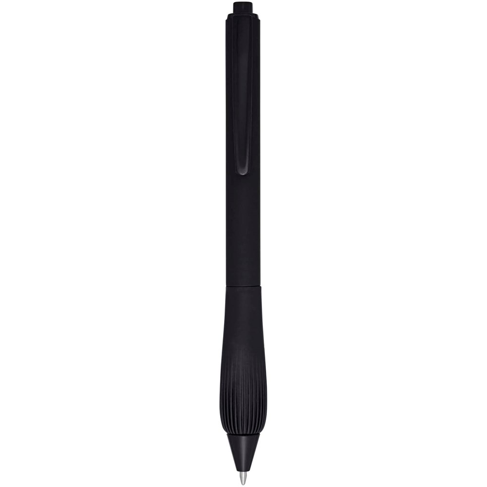 Kugelschreiber aus recyceltem Kunststoff mit gummiertem Schaft und Griff aus TPR. Tintenfarbe: Blau. Schreiblänge: 1000 Meter. Strichstärke: 1,0 mm.