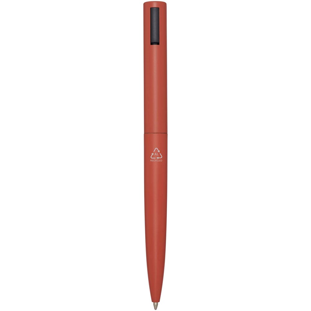 Kugelschreiber, dessen oberer Schaft aus recyceltem Kunststoff und dessen unterer Teil aus recyceltem Aluminium besteht. Der Clip besteht aus Eisen. Tintenfarbe: Schwarz. Schreiblänge: 1000 Meter. Strichstärke: 1,0 mm.