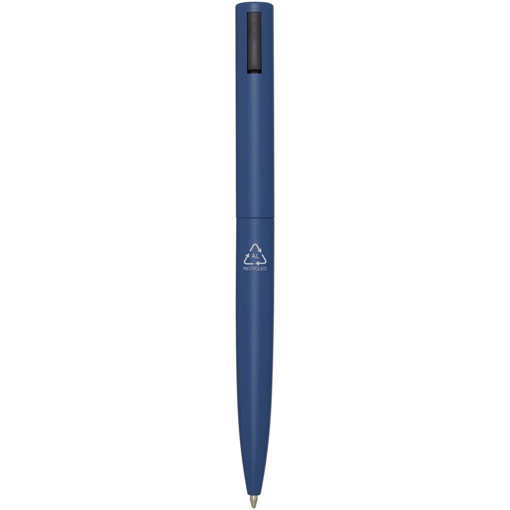Kugelschreiber, dessen oberer Schaft aus recyceltem Kunststoff und dessen unterer Teil aus recyceltem Aluminium besteht. Der Clip besteht aus Eisen. Tintenfarbe: Schwarz. Schreiblänge: 1000 Meter. Strichstärke: 1,0 mm.