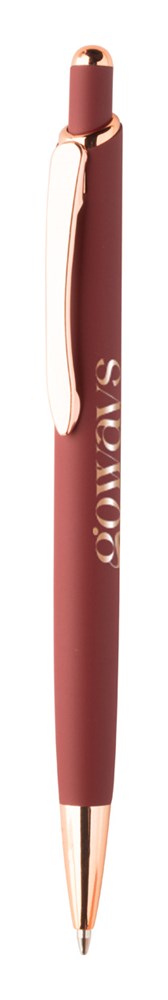 Kugelschreiber aus recyceltem Aluminium mit gummierter Oberfläche und rosagoldenen Elemnten Mit Spezialbeschichtung für rosagoldfarbene Spiegelgravuren. Blauschreibend.