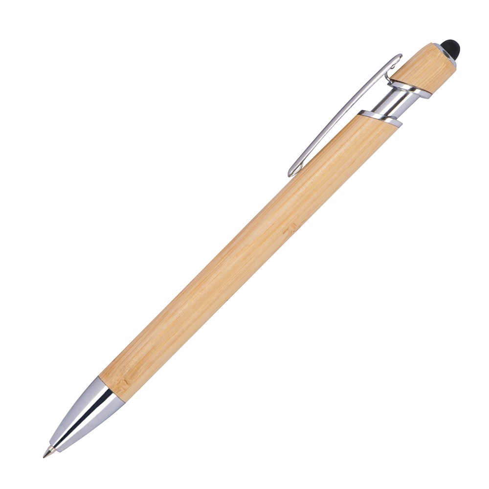 Kugelschreiber aus Bambus mit Touch-Pen. Der Kugelschreiber verfügt über silberne Kunststoffapplikationen sowie einen Metallclip und eine blauschreibende Kunststoffgroßraummine. Ihre Werbung bringen wir mittels einer Lasergravur am Schaft an.