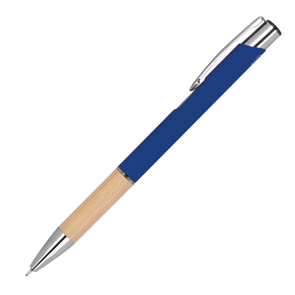 Semi Gelschreiber aus recyceltem Aluminium und rubber finish Oberfläche. Er verfügt noch über eine Bambusgriffzone, eine blauschreibende Kunststoffmine (0,5mm Tip) sowie silberne Applikationen. Ihre Werbung bringen wir mittels einer Lasergravur unterhalb vom Clip an.
