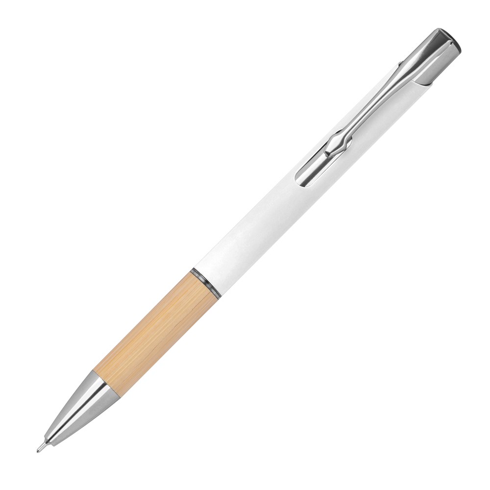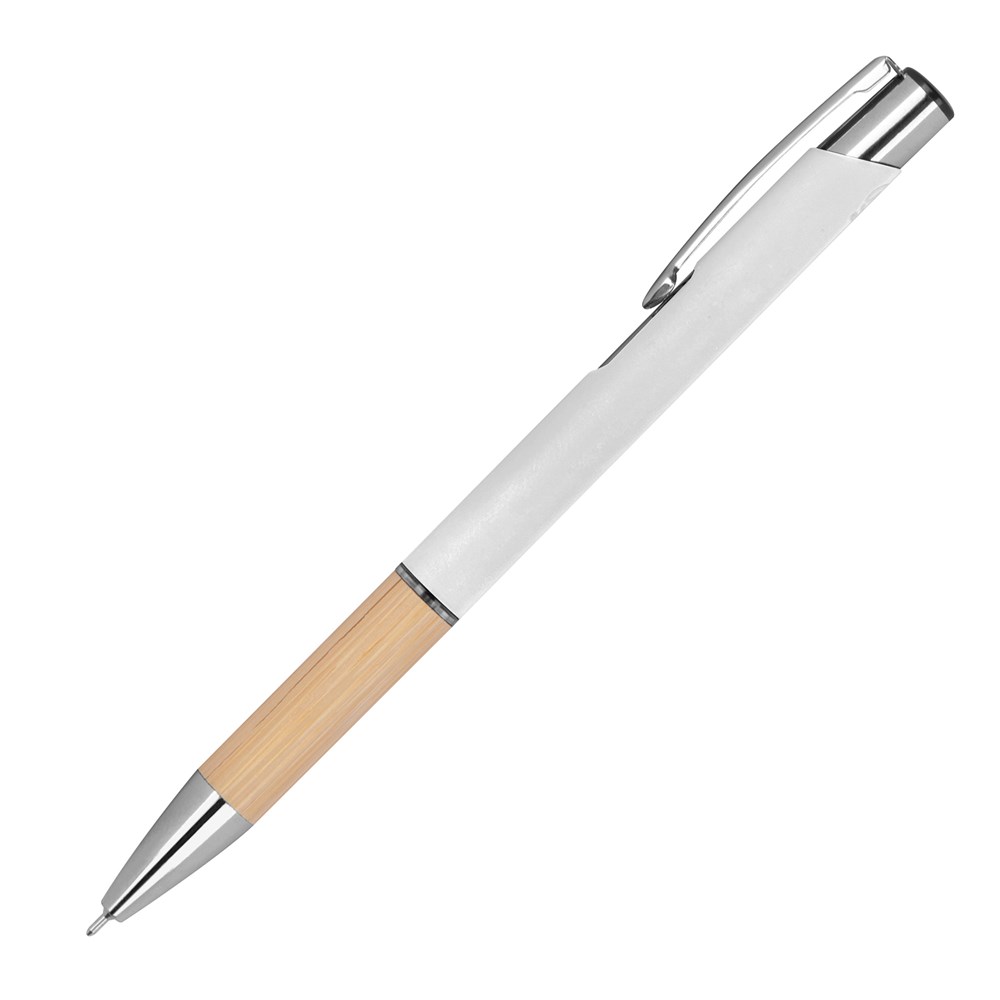 Semi Gelschreiber aus recyceltem Aluminium und rubber finish Oberfläche. Er verfügt noch über eine Bambusgriffzone, eine blauschreibende Kunststoffmine (0,5mm Tip) sowie silberne Applikationen. Ihre Werbung bringen wir mittels einer Lasergravur unterhalb vom Clip an.