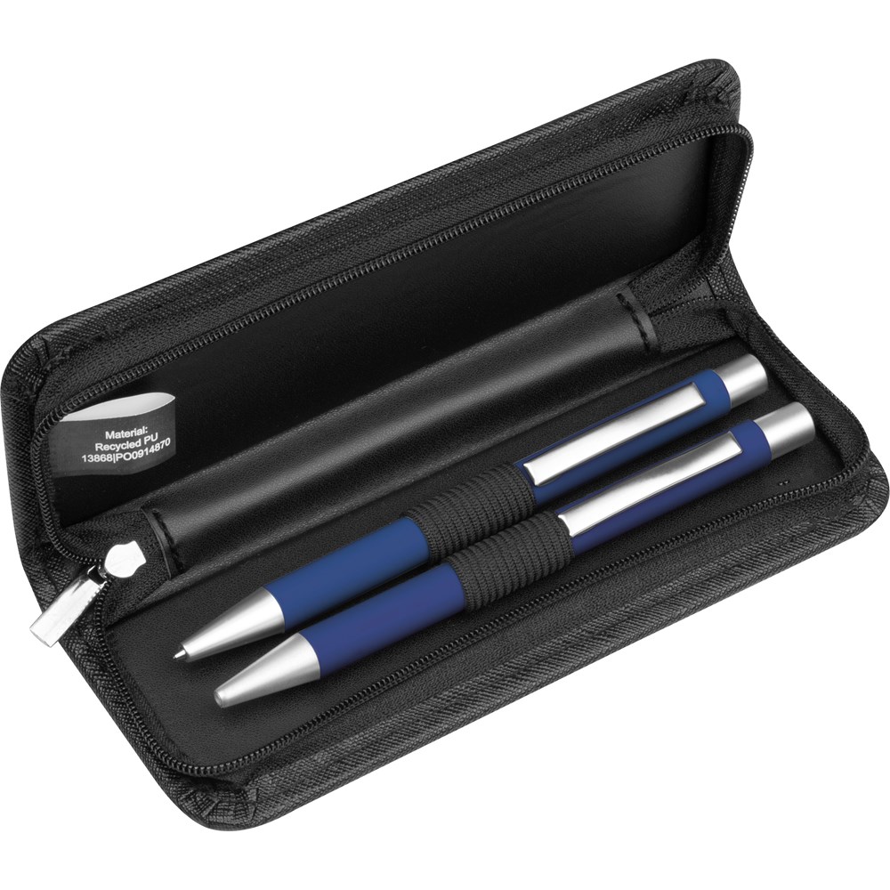 Schreibset bestehend aus einem blauschreibenden Aluminium Kugelschreiber mit einer Kunststoffgroßraummine und einem passenden Aluminium Druckbleistift mit zwei Bleistiftminen (0,5 mm). Beide Stifte verfügen über eine rubber finish Oberfläche die für eine angenehme Hapitk sorgt, das Etui besteht aus recyceltem PU. Ihre Werbung drucken wir auf das Etui. Gravur auf den Stiften auf Anfrage möglich.