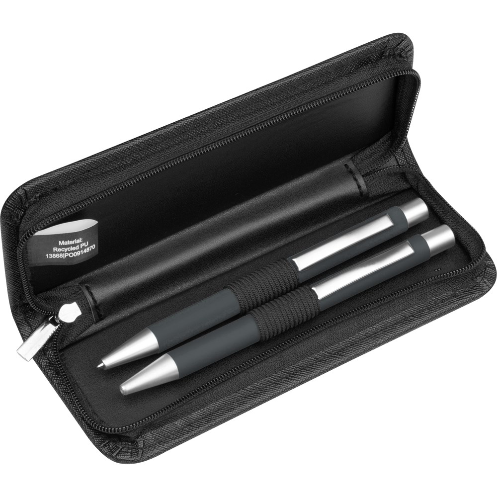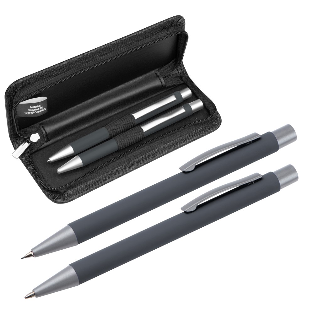 Schreibset bestehend aus einem blauschreibenden Aluminium Kugelschreiber mit einer Kunststoffgroßraummine und einem passenden Aluminium Druckbleistift mit zwei Bleistiftminen (0,5 mm). Beide Stifte verfügen über eine rubber finish Oberfläche die für eine angenehme Hapitk sorgt, das Etui besteht aus recyceltem PU. Ihre Werbung drucken wir auf das Etui. Gravur auf den Stiften auf Anfrage möglich.