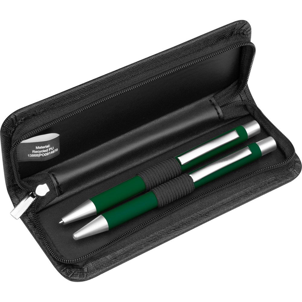 Schreibset bestehend aus einem blauschreibenden Aluminium Kugelschreiber mit einer Kunststoffgroßraummine und einem passenden Aluminium Druckbleistift mit zwei Bleistiftminen (0,5 mm). Beide Stifte verfügen über eine rubber finish Oberfläche die für eine angenehme Hapitk sorgt, das Etui besteht aus recyceltem PU. Ihre Werbung drucken wir auf das Etui. Gravur auf den Stiften auf Anfrage möglich.
