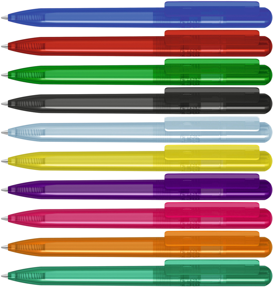 Drehkugelschreiber aus recyceltem PET-Material mit transparent glänzendem Gehäuse. mehr