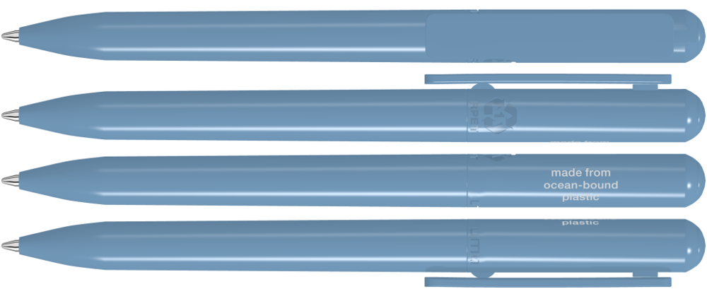 Drehkugelschreiber aus recyceltem PET-Material aus Ocean Bound Plastic mit gedeckt glänzendem Gehäuse. Das durch Plastic Bank gesammelte Ocean Bound Plastic, auch bekannt als Social Plastic®, wird in Europa zu einem recycelten PET Schreibgerät für einen langlebigen und nachhaltigen Werbeeinsatz upgecycelt.