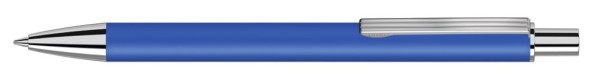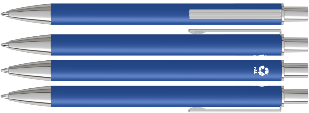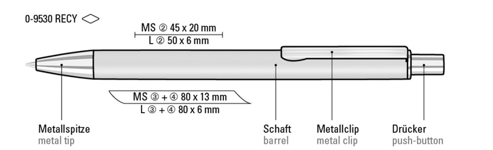 Metall-Druckkugelschreiber mit matter Oberfläche aus recyceltem Aluminium. Metallclip mit eingelassenen Rillen, Metallspitze und Drücker in silber glänzend.