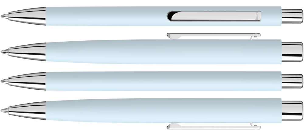 Metall-Druckkugelschreiber mit ellipsenförmigem mattem-Gehäuse. Metallclip, Metallspitze und Drücker silber glänzend.