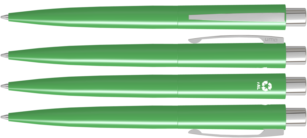 Metall-Druckkugelschreiber mit matt lackiertem Gehäuse aus recyceltem Aluminium. Metallclip und Drücker glanzverchromt.