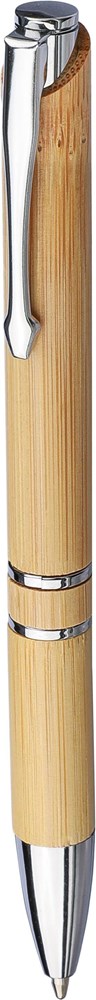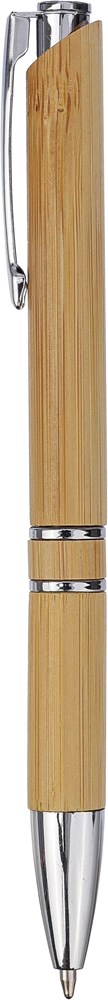 Kugelschreiber aus Bambus mit verchromten Metalldetails und Druckknopf. Ringe, Druckknopf und Spitze aus Kunststoff.Clip aus Metall. Ca. 800 Meter Schreiblänge. Schwarze Tinte.