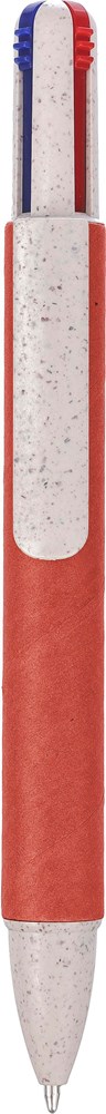 Vierfarbiger Kugelschreiber aus recyceltem Karton und Weizenstroh. Ca. 300 Meter Schreiblänge pro Farbe. Minenfarben: blau, schwarz, rot und grün.