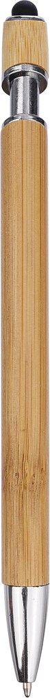 Kugelschreiber aus Bambus mit verchromten Metalldetails. Spitze aus verchromtem Kunststoff und einem Metallclip. Farbiger Stift auf dem Druckknopf. Ca. 800 Meter Schreiblänge. Blaue Tinte.