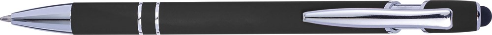 Aluminium-Kugelschreiber mit Gummibeschichtung und Gummispitze für Touchpad Bildschirme . Die Spitze und der Clip sind aus silberfarbenem Kunststoff. Schreibfarbe blau.