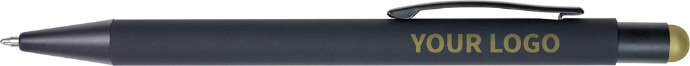 Gummierter schwarzer Kugelschreiber 'Formentera' mit Touch-Funktion. Der Schaft ist unter der Oberfläche in der Farbe des Touchpens lackiert, sodass diese beim Lasern zum Vorschein kommt. Mit blauer Mine.