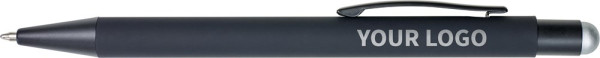 Gummierter schwarzer Kugelschreiber 'Formentera' mit Touch-Funktion. Der Schaft ist unter der Oberfläche in der Farbe des Touchpens lackiert, sodass diese beim Lasern zum Vorschein kommt. Mit blauer Mine.