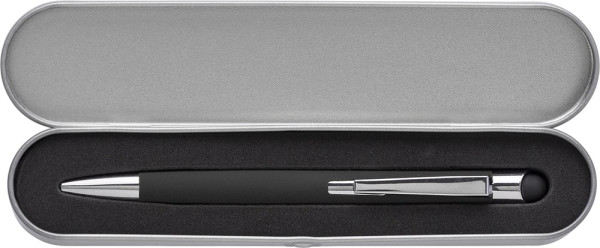 Rollerball aus Aluminium mit gummierter Griffzone, geeignet für Touchscreens. Wird in einem Stifte-Etui geliefert. Mit schwarzer Mine.