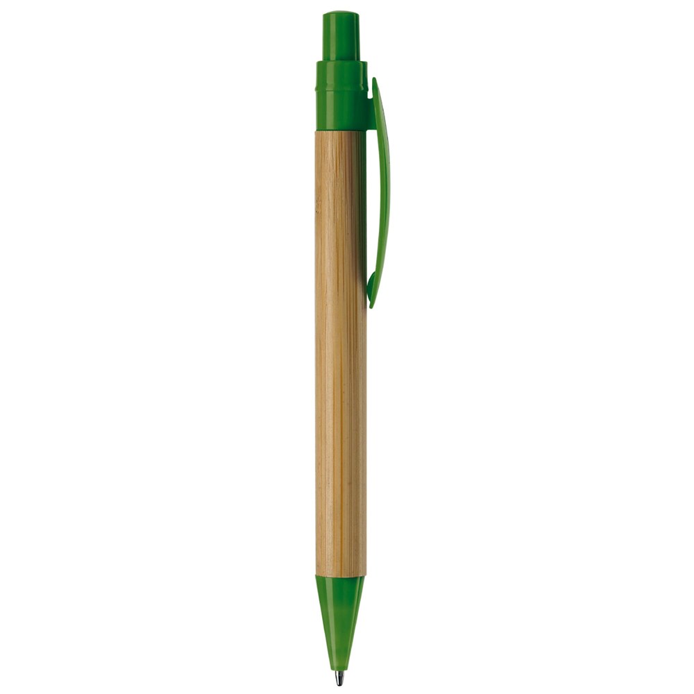 Bambuskugelschreiber mit Clip in Blattform. Farbiger Drücker und Unterteil, ausgestattet mit einer X20-Mine mit schwarzer Tinte. Bedruckung auf dem Clip möglich.