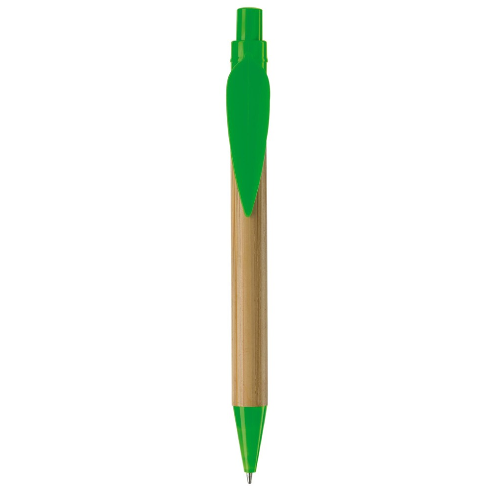 Bambuskugelschreiber mit Clip in Blattform. Farbiger Drücker und Unterteil, ausgestattet mit einer X20-Mine mit schwarzer Tinte. Bedruckung auf dem Clip möglich.