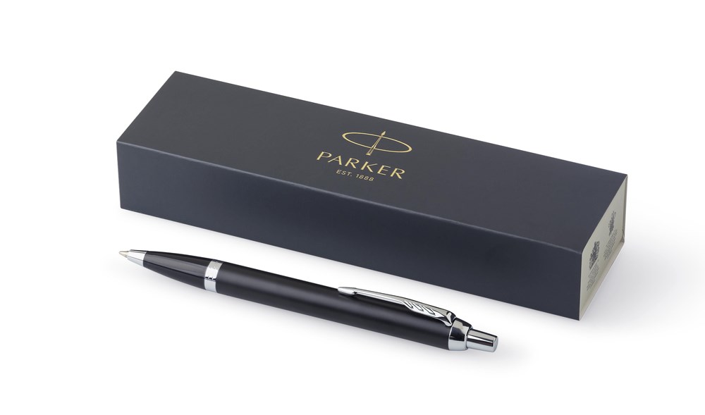 Parker IM Kugelschreiber aus Messing und Chrom. Schreibfarbe blau. Verpackt in einer Geschenkbox.