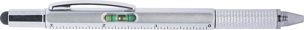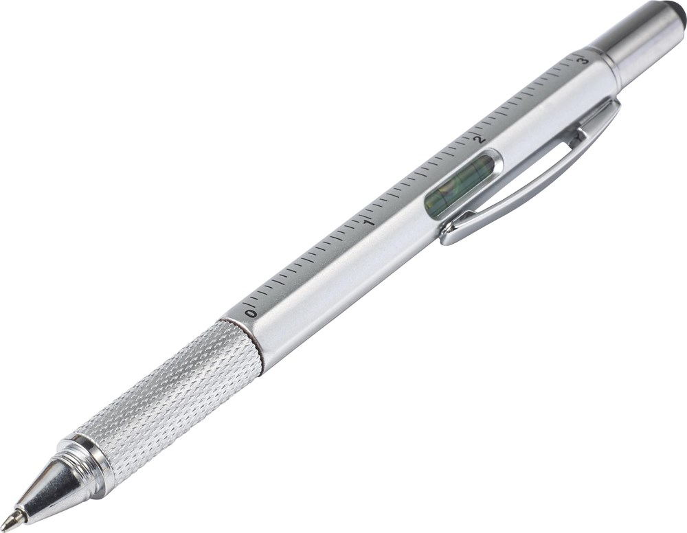 Multifunktionaler Kugelschreiber aus ABS mit Drehmechanik. Enthält eine Wasserwaage, ein Lineal und eine Gummispitze für kapazitive Bildschirme. Durch Drehen der Gummispitze kommt ein versteckter Schraubendreher zum Vorschein. Schwarze Tinte.