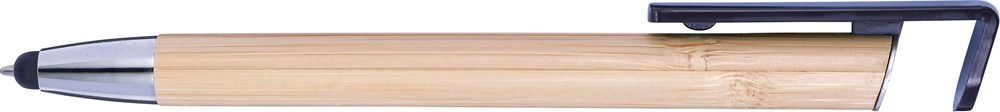 Bambus Kugelschreiber 'Sumatra' mit blauer Mine und Touchpen in einem. Der Schaft ist aus Bambus, der Halter und die Spitze aus Kunststoff. Der Clip dient als Druckknopf und gleichzeitig als Smartphonehalter.