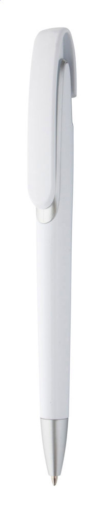 Kunststoff-Kugelschreiber mit silberner Spitze, blauschreibend.