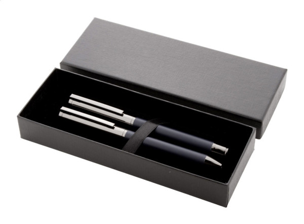 Elegantes Schreibset aus Metall, bestehend aus Kugelschreiber und Rollerball, verpackt in schwarzer Geschenkschachtel, blauschreibend.