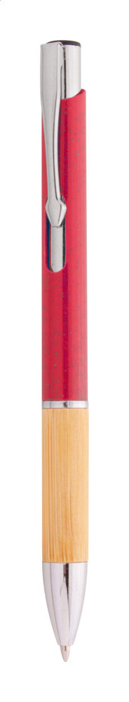 Kugelschreiber aus ökologischem Weizenstrohkunststoff mit Bambus-Griffzone und Elementen aus Metall, blauschreibend.