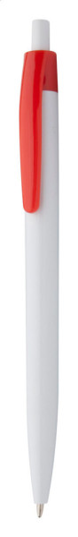Weißer Kunststoff-Kugelschreiber mit farbigem Clip, blauschreibend.