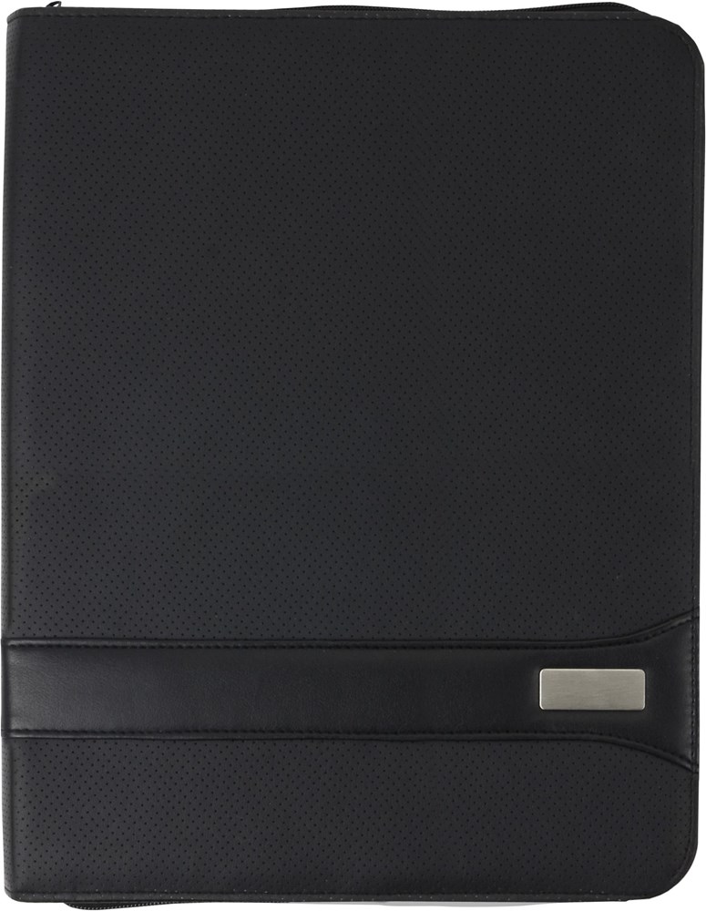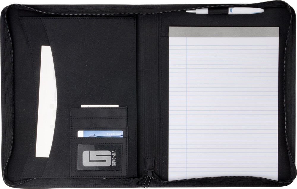 Dokumentenmappe aus PVC, ca. DIN A4-Format, mit 6 Einsteckfächern, Stifthalter (ohne Stift), Metallplättchen für Gravuren und Schreibblock (30 linierte Blätter).