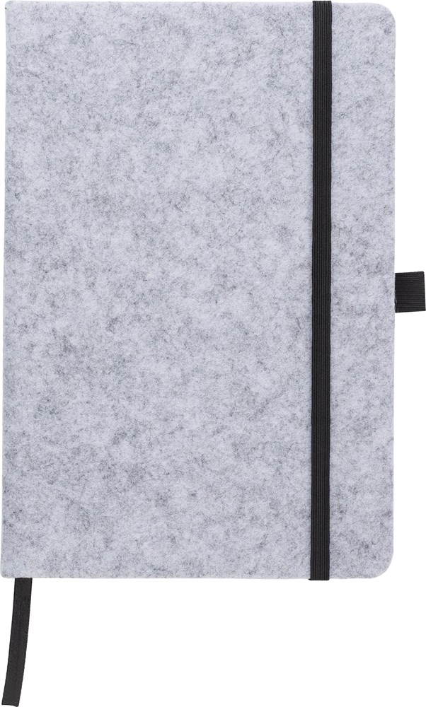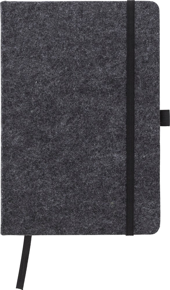Notizbuch aus rPET-Filz (A5), mit 160 linierten Seiten, Stiftschlaufe, Lesebändchen und Gummiband über dem Umschlag.