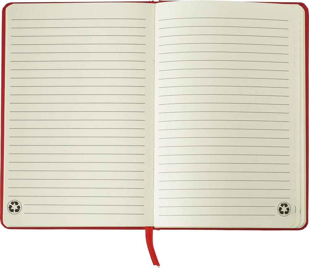 Notizbuch aus recyceltem Karton (A5) mit 160 linierten Seiten. Mit Gummiband zum Verschließen und gleichfarbigem Lesezeichen mit Schleife.