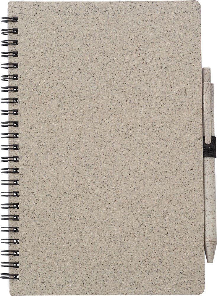 Notizbuch mit Cover aus Weizenstroh und PP mit Stiftschlaufe, inkl. Kugelschreiber aus Weizenstroh, blaue Mine. Das Notizbuch hat 70 linierte Blätter. Ca. DIN A5-Format.