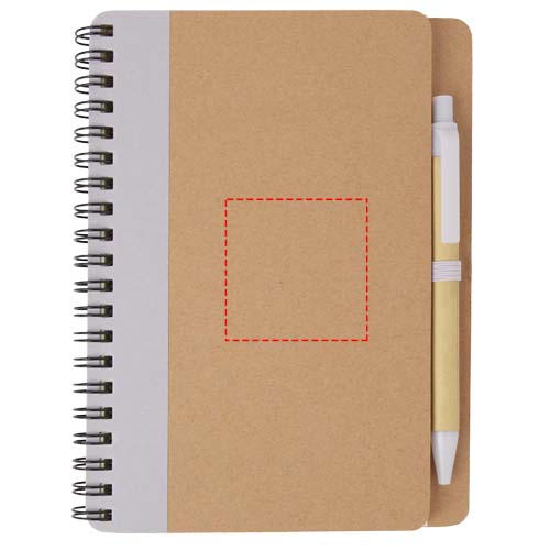 Notizbuch mit Deckel aus Recyclingkarton, 60 Blatt liniertem Recyclingpapier und passendem Stift. Das Notizbuch und der Stift sind zusammen verpackt.