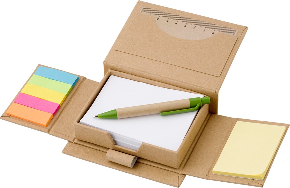 Notizzettelhalter aus Karton, mit 6x 25 Haftnotizen, 150 Notizblättern, Einsteckfach auf der Deckel-Innenseite, Linealaufdruck und Kugelschreiber aus Karton mit Applikationen aus Kunststoff und blauer Mine.