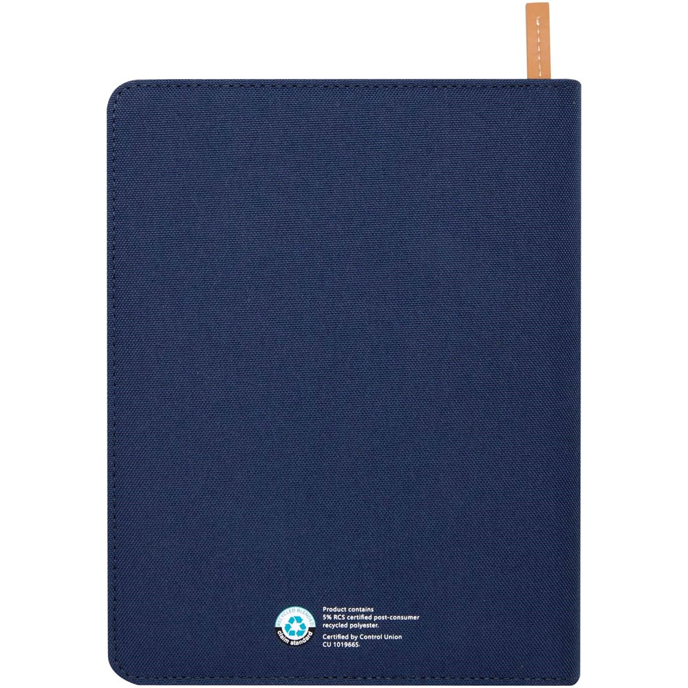 Die Nomumi A5 Mappe mit abgerundeten Ecken ist ein praktisches Büroutensil aus recyceltem Kunststoff. Die Mappe umfasst 64 cremefarbene 80 g/m2 linierte Seiten, einen Reißverschluss, eine Stiftschlaufe und eine erweiterbare Tasche.