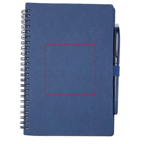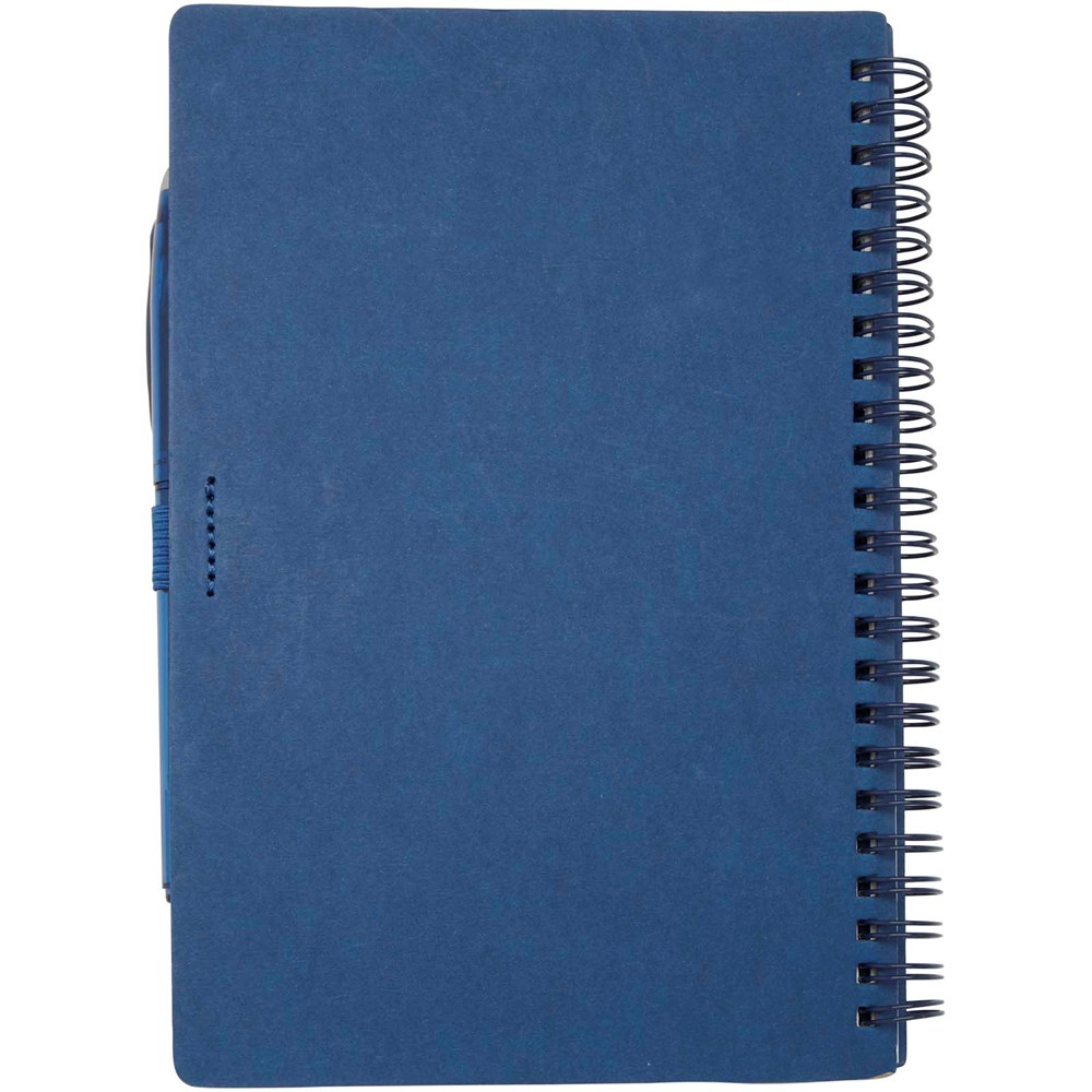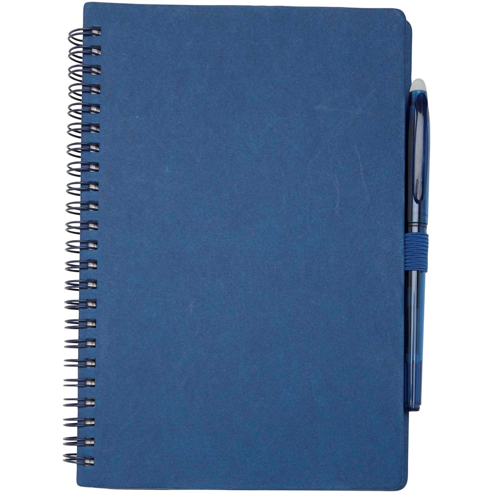 Wiederverwendbares A5 Hardcover Notizbuch und Stiftset aus Steinpapier. Das Notizbuch hat einen Einband aus Karton, abgerundete Ecken und besteht aus 32 linierten Seiten aus 120 g/m² Papier. Steinpapier ist 100 % holzfrei und der Produktionsprozess verbraucht weniger Energie als recyceltes oder neues Zellstoffpapier. Auf der Rückseite befindet sich eine Tasche für ein schwarzes Reinigungstuch (im Lieferumfang enthalten). Der radierbare Stift besteht aus recyceltem Kunststoff mit transparentem Schaft, weißem Radiergummi auf der Oberseite und einfarbigem Griff. Tintenfarbe: Schwarz. Schreiblänge: 250 Meter. Schreibspitze: 0,7 mm.