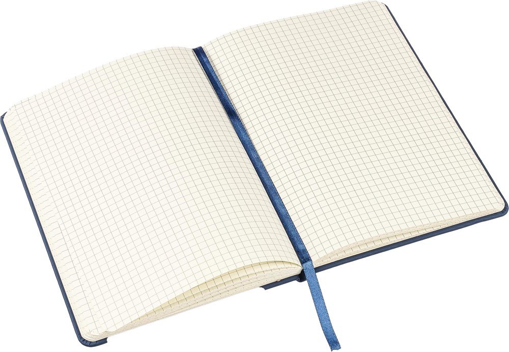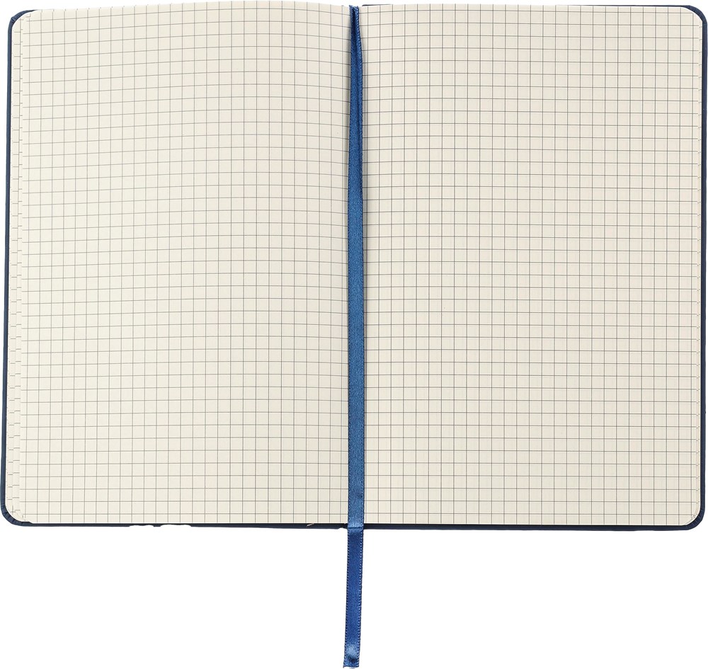 Notizbuch aus PU (ca. A5) mit 96 karierten Seiten im 5 mm Raster ohne Rahmen. Mit Lesebändchen und Gummizug am Einband.