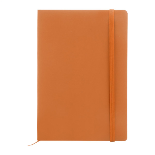 A5 Notizbuch aus recyceltem Kunstleder mit Softcover und 80 linierten Seiten aus Recyclingpapier. Mit farblich abgestimmten Lesezeichen und Gummiband.