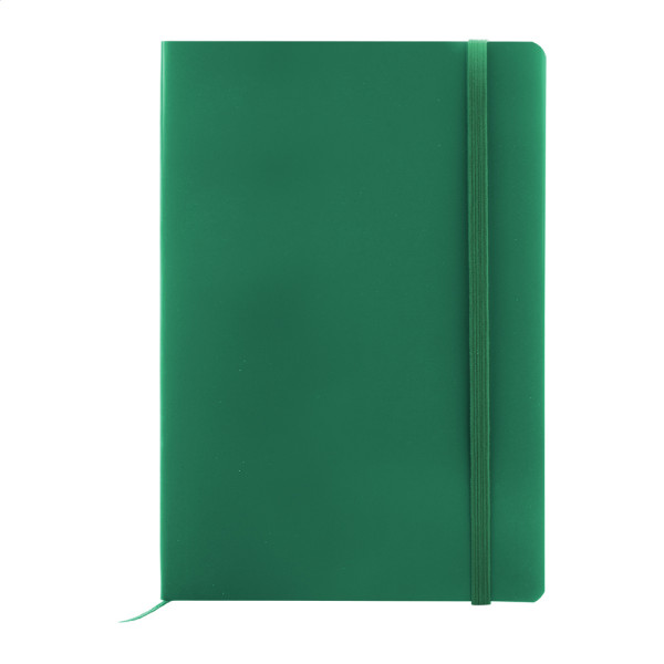 A5 Notizbuch aus recyceltem Kunstleder mit Softcover und 80 linierten Seiten aus Recyclingpapier. Mit farblich abgestimmten Lesezeichen und Gummiband.