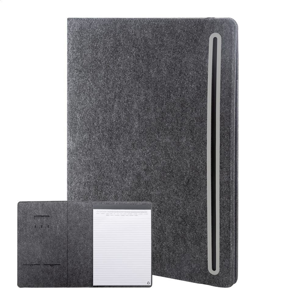 Dokumentenmappe im A4-Format aus RPET-Filz mit einer Fronttasche und mehreren Organizerfächern innen. Enthält einen Notizblock mit 20 linierten Seiten aus recyceltem Papier.
