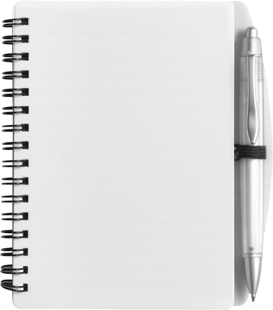 Notizbuch aus Kunststoff, ca. DIN A6-Format, mit 65 linierten Blättern und farblich passendem Kunststoff-Kugelschreiber.