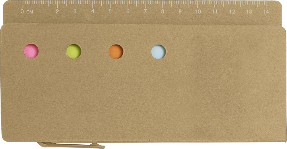 Haftnotizen-Set mit Lineal-Aufdruck, bestehend aus 5 verschiedenen Haftnotizen (je 100 Blatt, 4x klein, 1x groß) und Kugelschreiber aus Karton/Kunststoff (blaue Mine) mit Clip und Spitze aus Kunststoff.