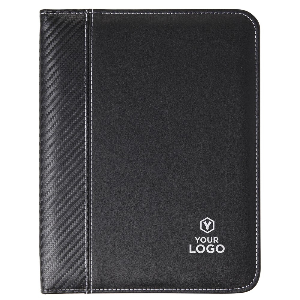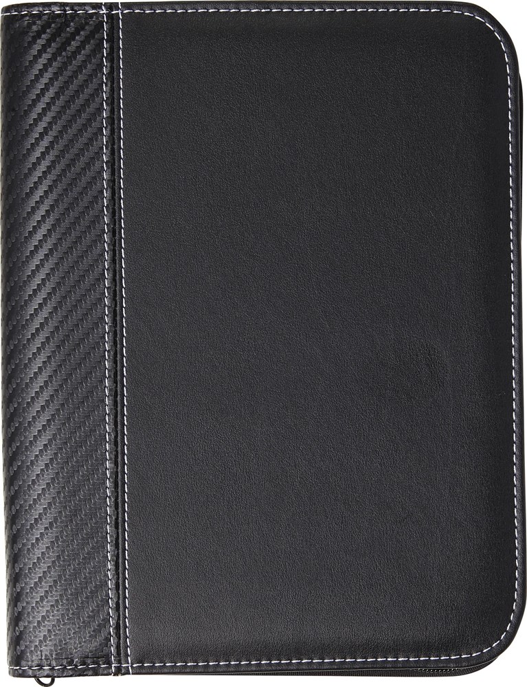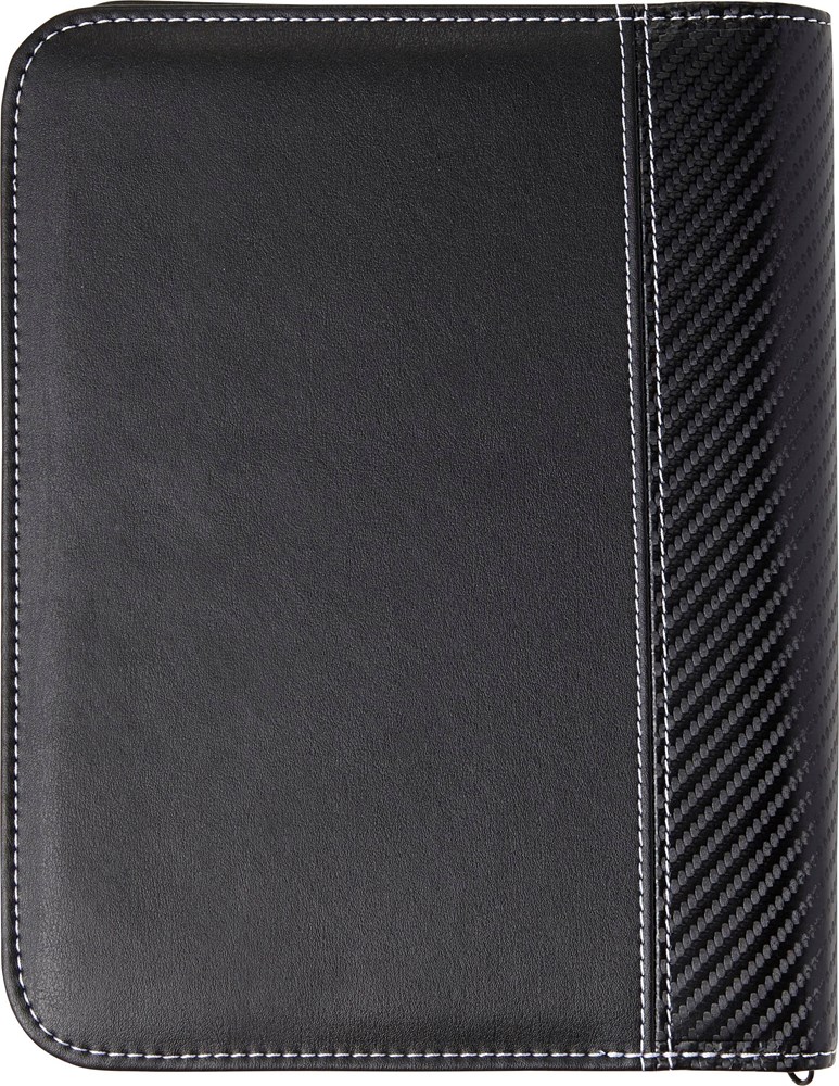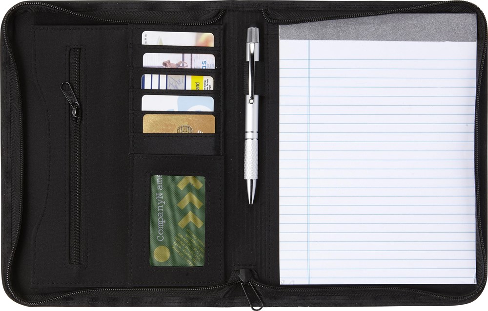 Dokumententasche aus PU, ca. DIN A5-Format, mit weißen Ziernähten, Reißverschluss, diversen Fächern, Stifthalter (ohne Stift) und Schreibblock (liniert).