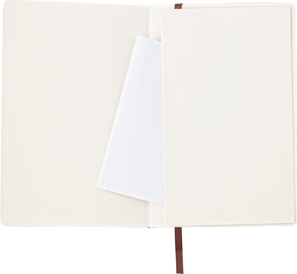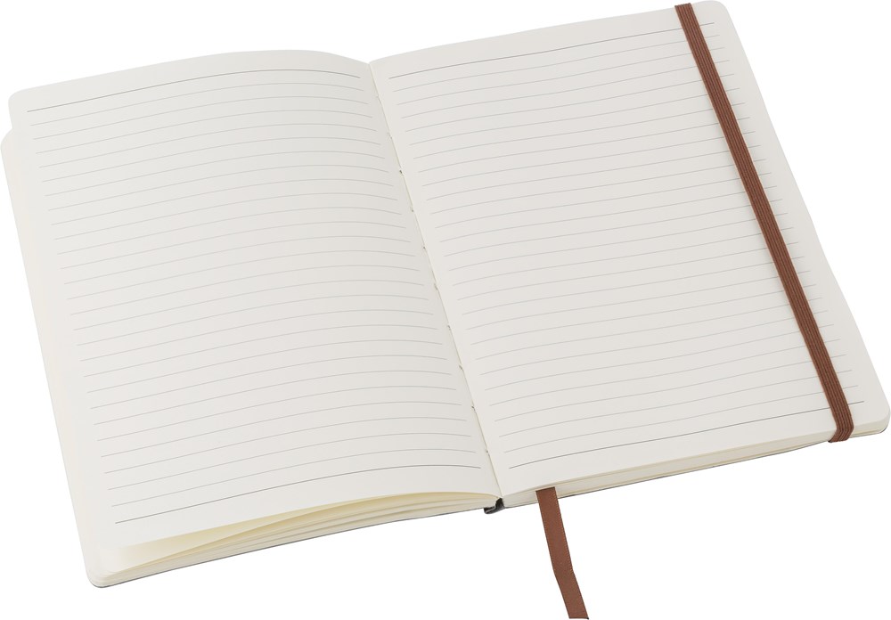 Notizbuch mit PU-Umschlag im DIN A5 Format mit 80 linierten Blättern, Lesezeichen, Fach auf der Innenseite des Umschlags und elastischem Band zum verschließen.