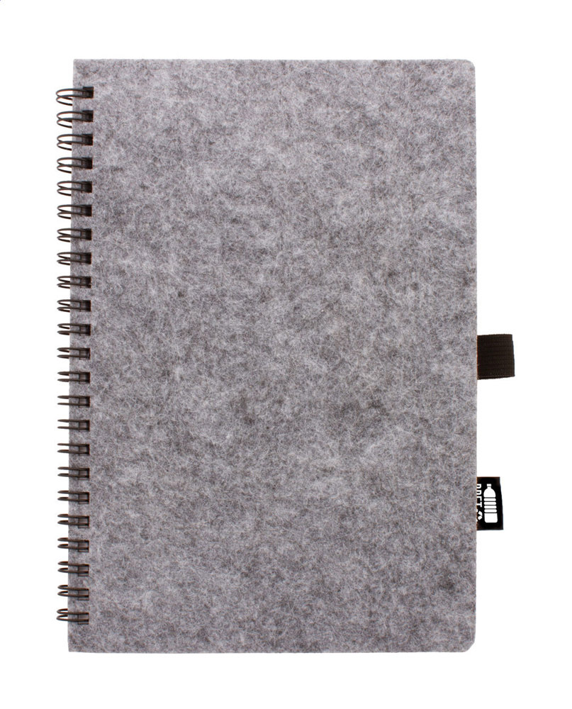 Mit RPET-Filz überzogenes Spiralnotizbuch, RPET-Label und 80 linierten Blättern aus recyceltem Papier. Format A5.